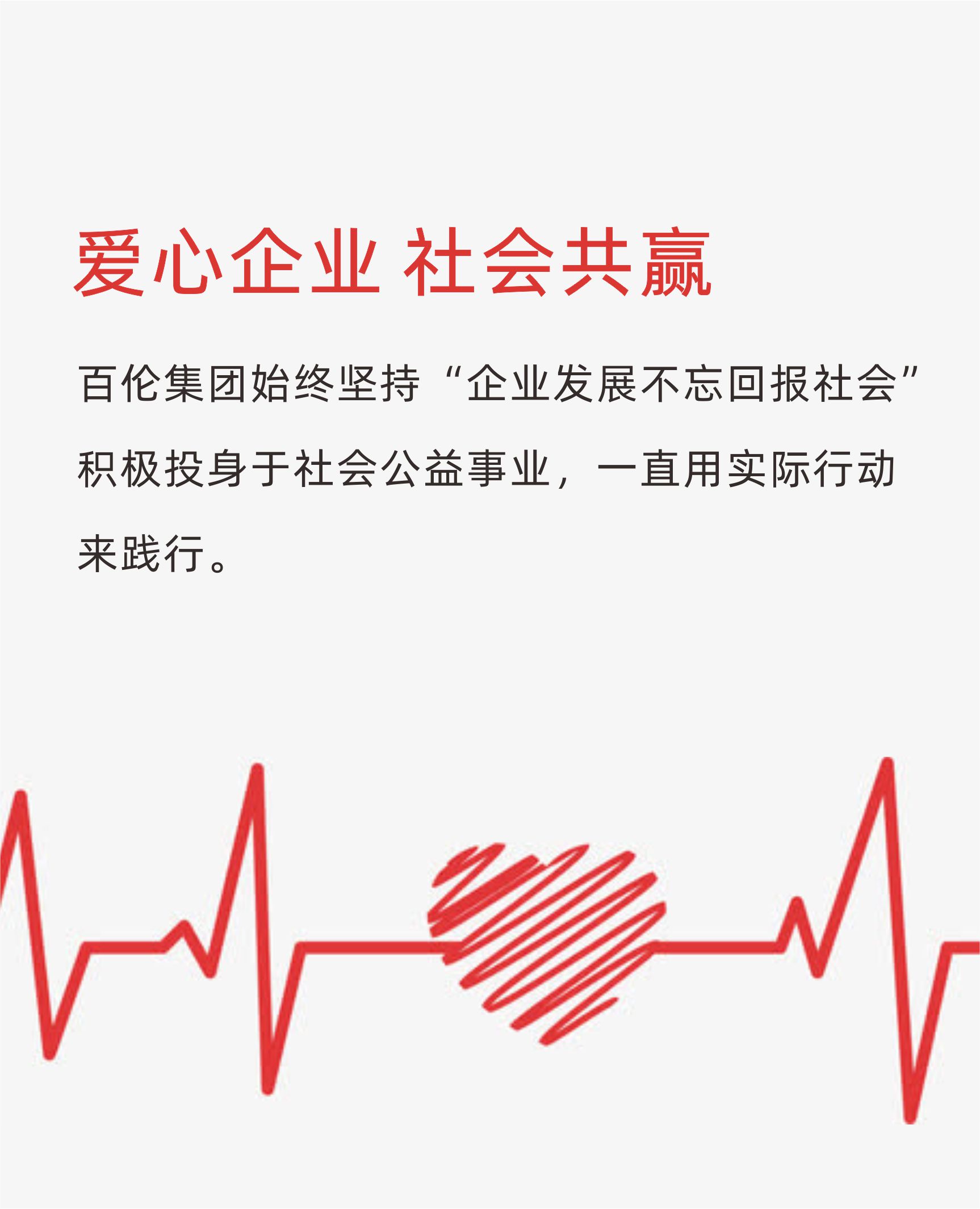 善義為本,和諧創世。當高度的企業公民社會意識和責任感融入百倫集團的文化血脈,在一路的不斷超越中,百倫集團將為社會公益事業不遺余力,推動城市向前。